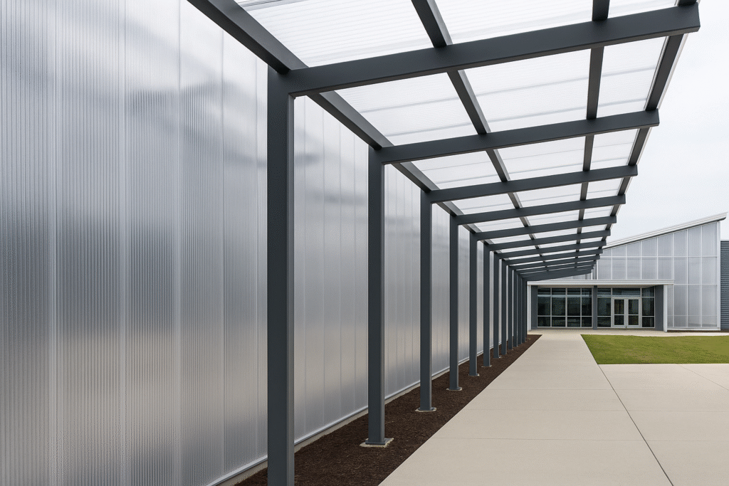 Polycarbonate façade solution with a clean-line, interlocking panel design.