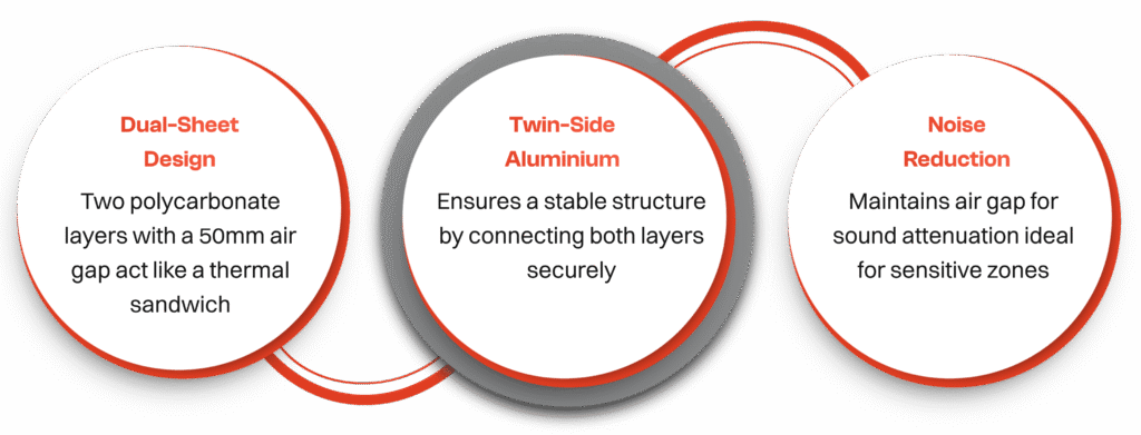 The Double Glaze Roofing System features a dual-layer polycarbonate setup with an air gap at its core — a sandwich construction engineered for superior thermal performance, reduced energy costs, and noise reduction. Ideal for projects where insulation is non-negotiable.