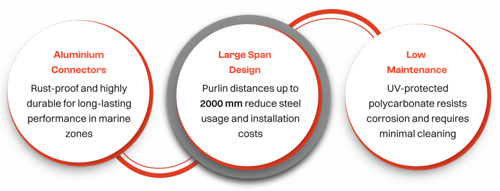 The Infinity Roofing System is purpose-built for large-span structures that demand corrosion resistance and structural elegance. Engineered with aluminium connectors and advanced polycarbonate panels, it withstands the harshest weather and coastal climates while delivering design flexibility and long-term performance.
