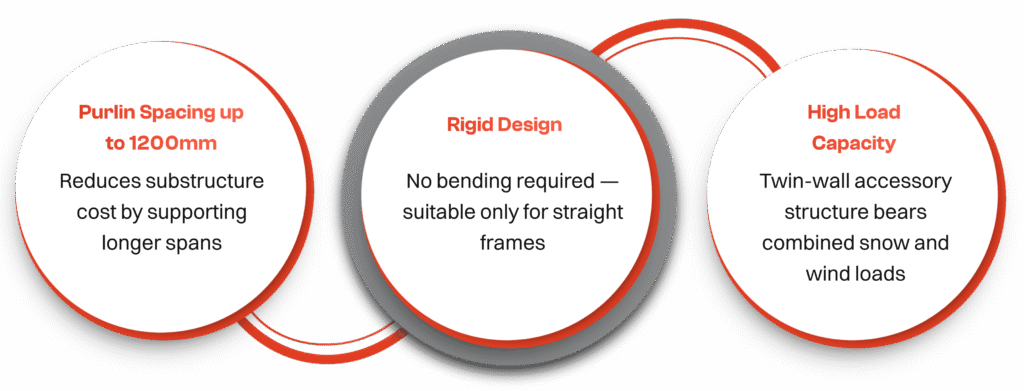When projects demand wider coverage, reduced substructure cost, and performance in harsh weather, the Large Span Roofing System steps up. Designed with a rigid twin-wall structure, it supports heavy loads from wind, snow, and rainfall — with purlin spacing that reaches up to 1200mm.